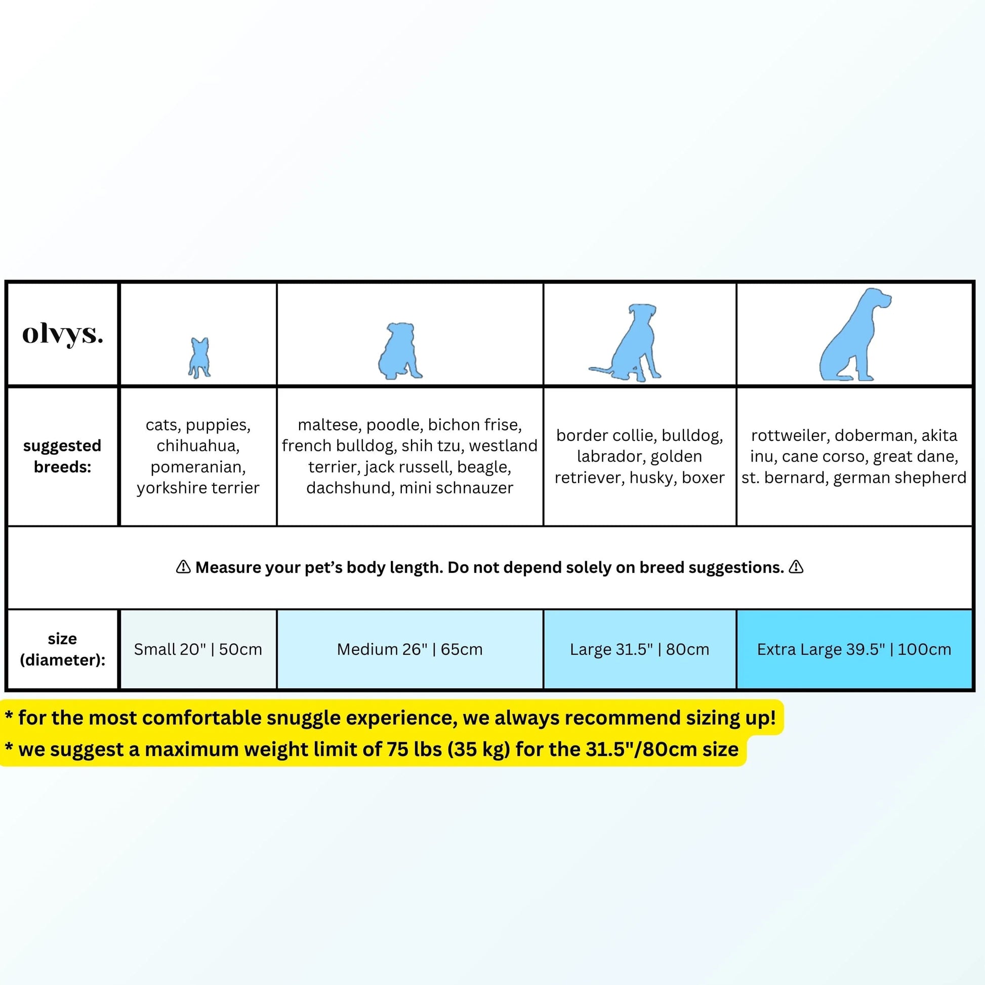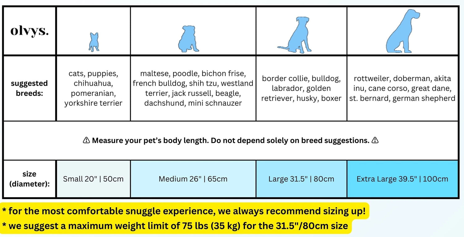 While our size guide helps most customers find the perfect fit initially, we understand that every pet is unique. If the bed is too snug or spacious, we offer a hassle-free exchange policy to ensure your pet’s comfort. Just reach out to us at tryolvys@outlook.com, and we’ll take care of the rest!